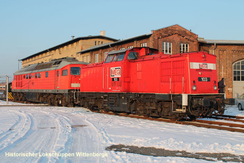 Our two new acquisitions rolled into Wittenberge depot on February 12, 2013 In the foreground is MEG loco No 103, formerly DR No. 114 774-3, behind it is MEG No. 317, formerly DR No. 132 500-0 (photo: D. Kathke).