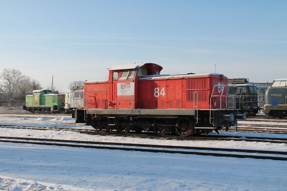 On December 7, 2012, our V60D diesel shunter MEG 84 is deep frozen and waiting for warmer weather. In the meantime, it is resplendent in its original condition in orange, as 345 072-3.