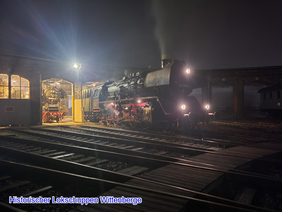 We used the night's rest on 9 May 2023 to take an atmospheric night shot of steam locomotives 01 509 and 50 3570 in front of our engine shed.