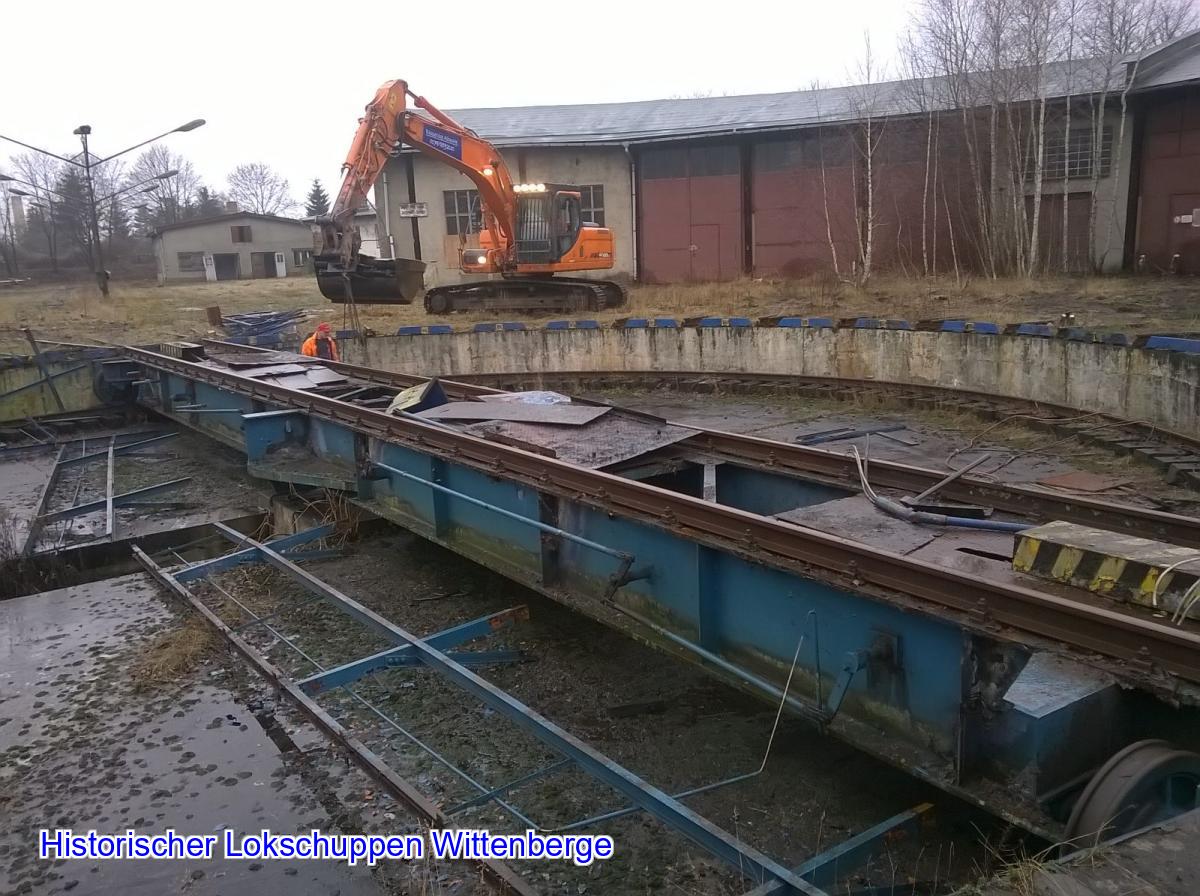 On 11 January 2016, we dismantled the turntable in Parchim with the help of a friendly company from Salzwedel. Not so that it could be turned into scrap metal. Rather, we were able to acquire the devices at the time in order to obtain a suitable turntable with a diameter of 20 metres for the planned reconstruction of locomotive shed 1 in Wittenberge. The parts of the turntable are now in storage in Wittenberge.
