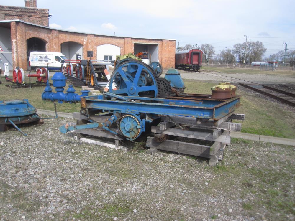 On one side we see the drive unit from the Parchim turntable which it is planned eventually to install in the floor where loco shed No. 1 once stood. The drive gearing which transmits the power from the electric motor mounted on it to the driving wheels (presently not fitted) underneath the unit, is contained in this unit. It is also possible to connect a heavy cable-winch to the drive which makes it possible to haul unpowered vehicles onto the turntable.
