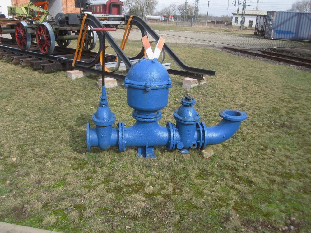 When the feed-valve of a water crane is opened, considerable pressure may be built up on the pipes behind it by the inflowing water, and damage them. The air chamber is designed to absorb this pressure wave and effectively to act as a shock absorber. The parts painted blue are normally situated underground. Only the handwheel to open and close the feed-valve is seen projecting above ground.