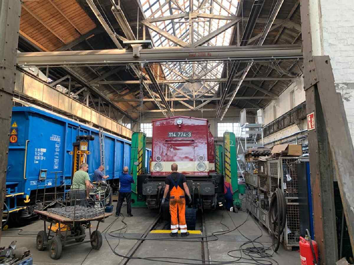 Today a small special report about the running gear inspection on our diesel locomotive of the class V100, which bears the road number 114 774-3. As already reported in the last newsletter, the locomotive is now undergoing this inspection in order to be allowed to run freely on the rail network in Germany. For this purpose, the locomotive's running gear has to be checked and repaired if necessary. On Saturday, the first major step was taken and the locomotive body was separated from the two bogies. To do this, the locomotive body was lifted by means of a lifting device and the two bogies were moved out.