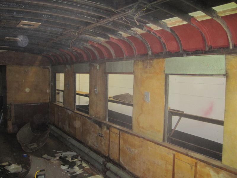 The interior is currently almost completely gutted. We determined that most of the wooden wall panels were reusable. Their surfaces will be treated and repainted in the near future. The inner roof cladding has been removed to inspect the roof frames, the electrical system for the ceiling lighting and the mechanisms for the ceiling fans.