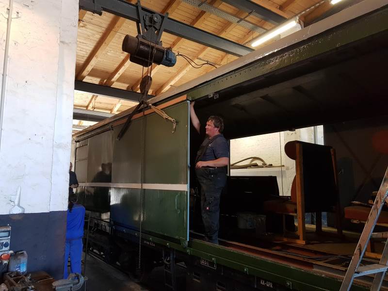 At the weekend members worked hard on the car carrier. After the corrosion restoration was completed, the side sliding doors could be reinstalled, through which the state cars would be driven from a side loading ramp into the car in the early hours of the morning. Since a relatively acute angle was needed for this, the doors are correspondingly large. On each side of the car are two doors, each one about 3.5 metres wide, which open up an approximately seven-metre-wide entrance when pushed open sideways. With these dimensions you can guess what a door weighs. Accordingly, they could only be set up today with the help of the shed crane. The first picture shows the assembly work, the second the car after assembly on the turntable.