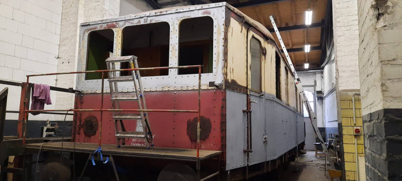 A historical freight wagon is in the process of being renovated. The two-axle wagon has side walls of a steel framework, covered with wooden planks. The construction had suffered a lot over past decades and is now being completely refurbished. The steel parts will be derusted, repainted and replaced where necessary. New wood panelling is then installed.