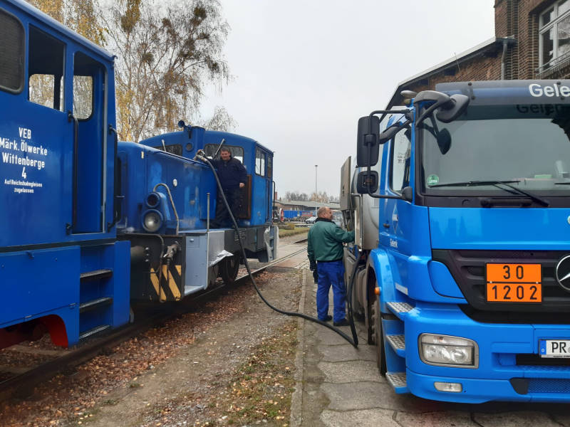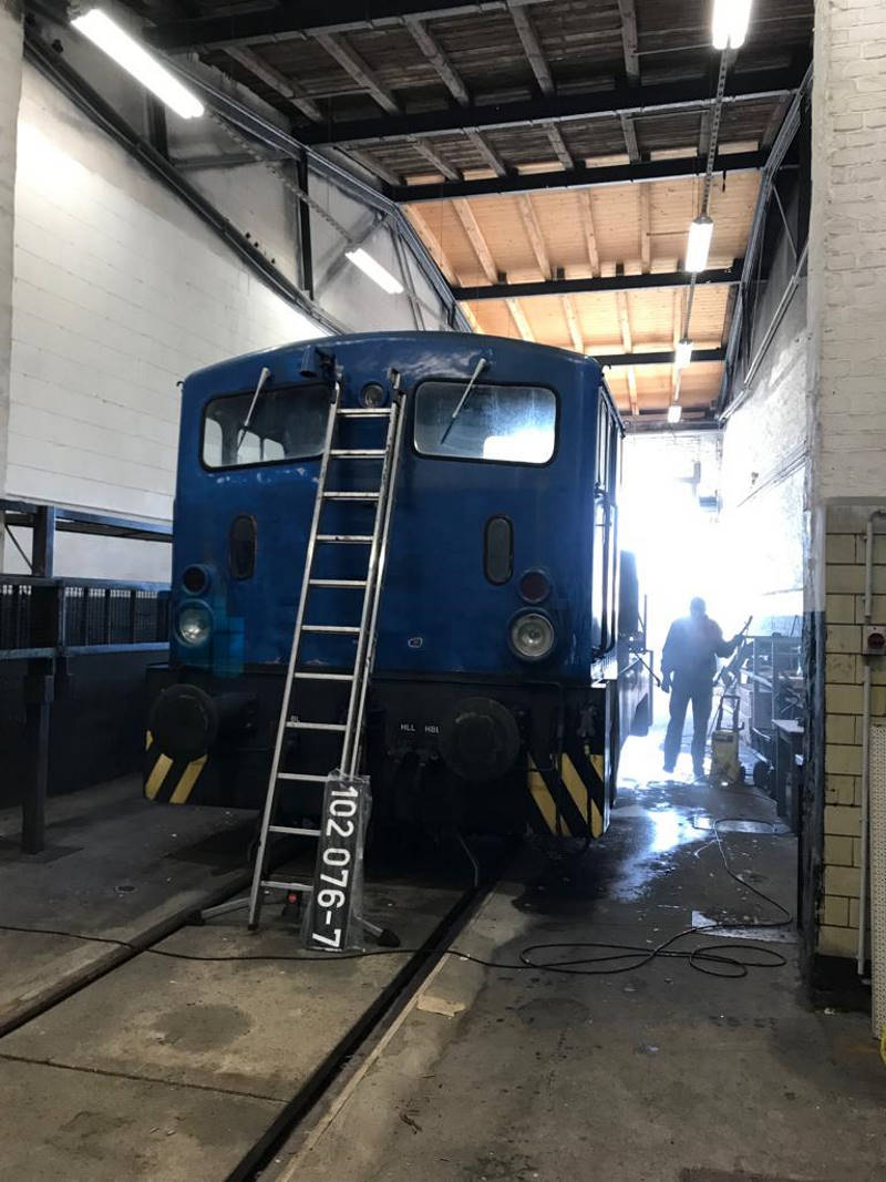 One of the two operable class V23 diesel locomotives was taken to the workshop to be thoroughly cleaned. The locomotive has so far the number 2 of the Stendal pulp mill and a blue livery. It will soon be painted orange and bear the number 102 076. This is a reminder of the use of an identical locomotive with this number at the Wittenberge depot in the days of the Deutsche Reichsbahn. The locomotive is to be used in future together with the VB 197 805 sidecar, which will soon be operational again. This combination of such sidecars and locomotives used to be typical for the branch lines in the Prignitz and the neighbouring Altmark.
