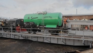 Es ist bereits später Nachmittag, als die Rangierlok den Bierwaggon auf die Drehscheibe schiebt. Wenig später rollt er durch das Tor 13. |