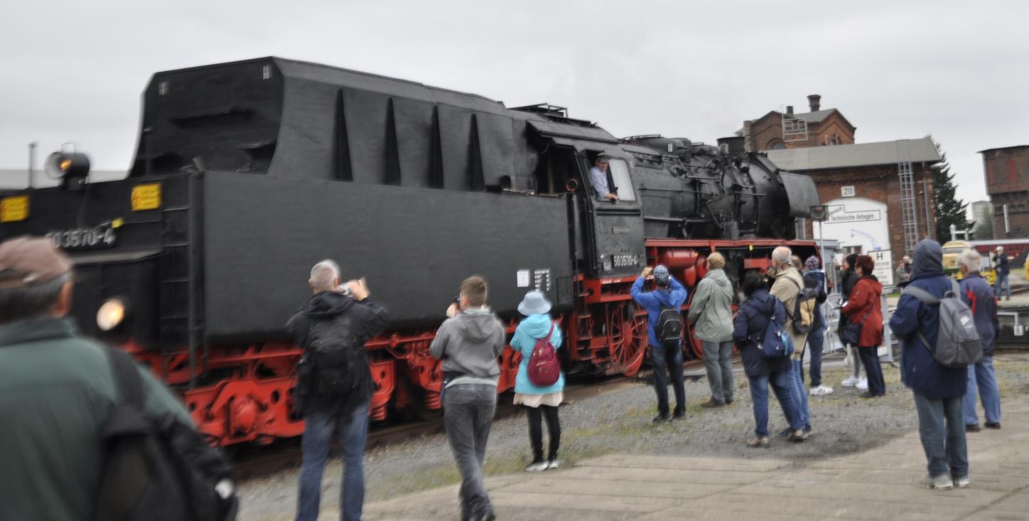Bereits vor dem Lokschuppen-Gelände sind die Eisenbahnfans in Aktion. Mit Kameras und Smartphones ausgerüstet fotografieren sie die Dampflok der Baureihe 50.35, die gerade vor dem Stellwerksgebäude einfährt. „Mit ihr können die Besucher eine große Führerstandsfahrt unternehmen“, so Mangelsdorf.