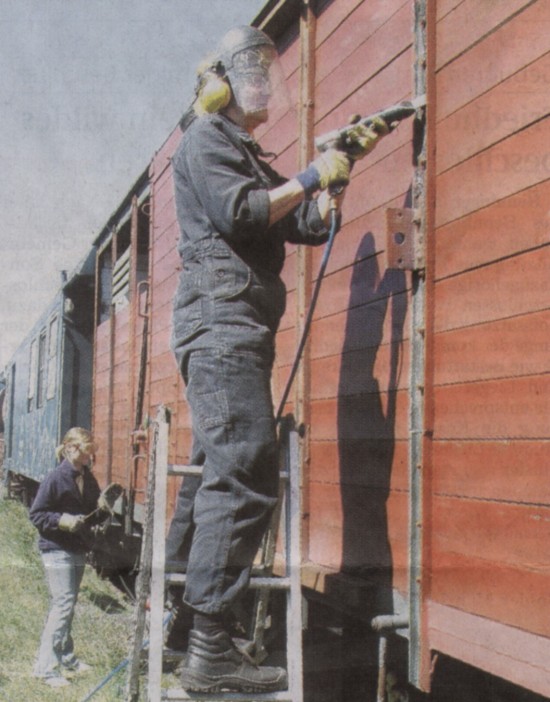Conny Förster (vorn) und Andrea Schulz aus Lüdersdorf vom Historische Eisenbahnen West e.V. restaurieren in Salzwedel einen Güterwaggon. |