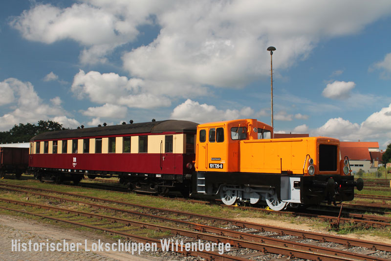 Light tractor loco 101 726-8 poses along with railcar trailer 197 805-5 in the area where loco roundhouse No. 1 used to stand.