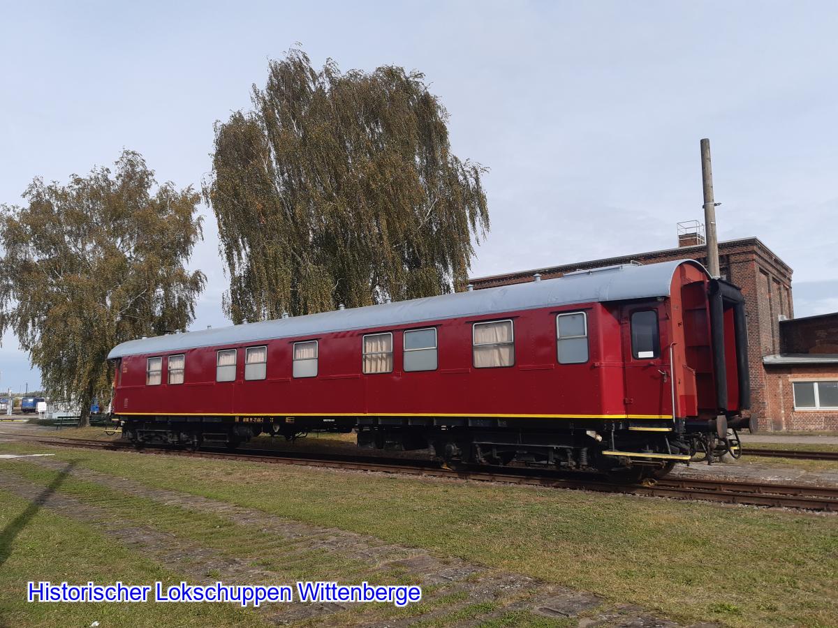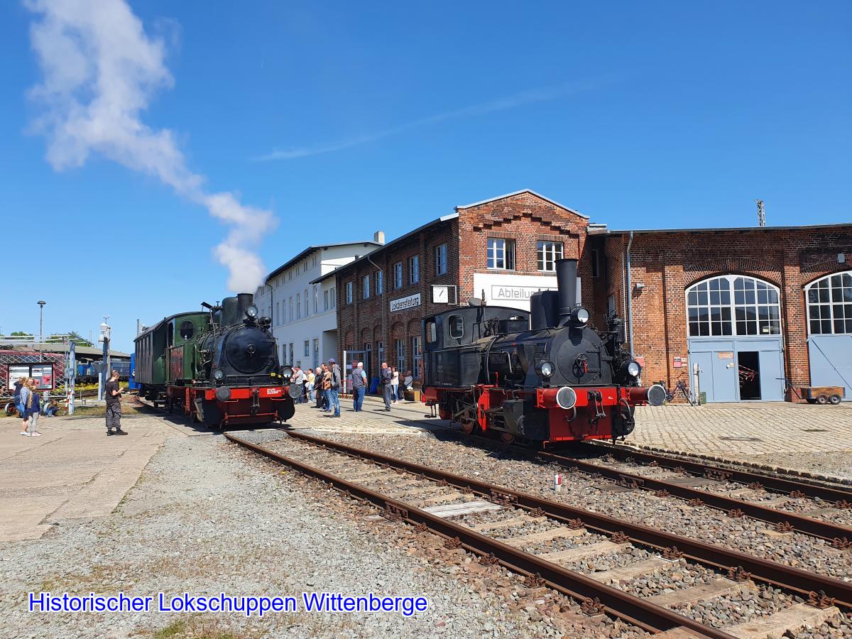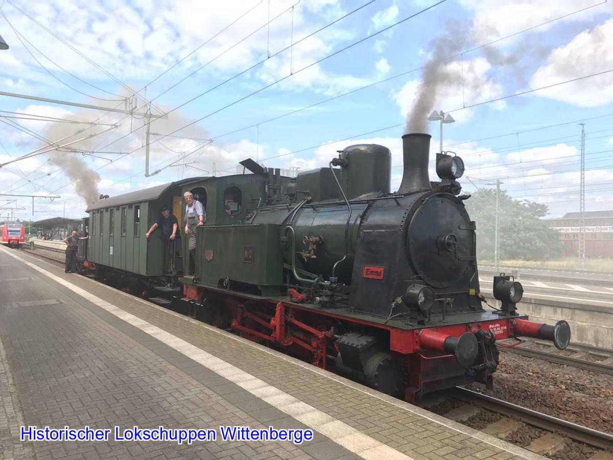 Our steam locomotive Emma and the locomotive Pritzwalk from Eisenbahngesellschaft Potsdam were also allowed to leave the museum grounds to harness a special train through the port of Wittenberge. On 3 July 2021, our little special train stands on the platform at Wittenberge main station.