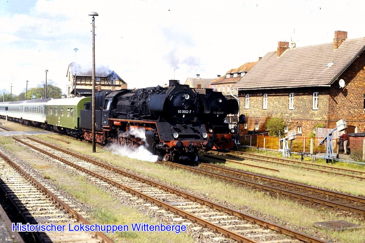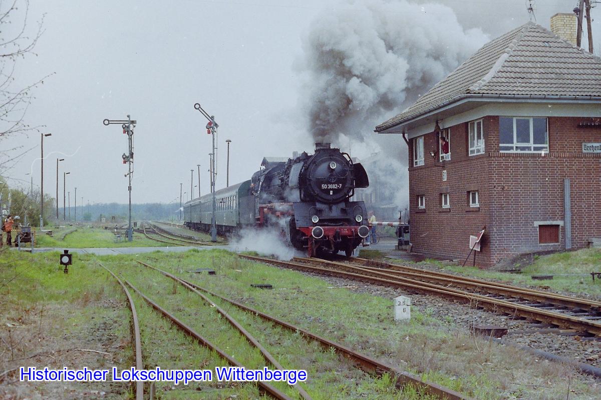 On 17 May 1997, our steam locomotive 50 3682 was a guest at the Prignitzer Eisenbahn station festival in Pritzwalk. The photo was taken from the signal box in Pritzwalk. The Pritzwalk railway station can be seen in the background.