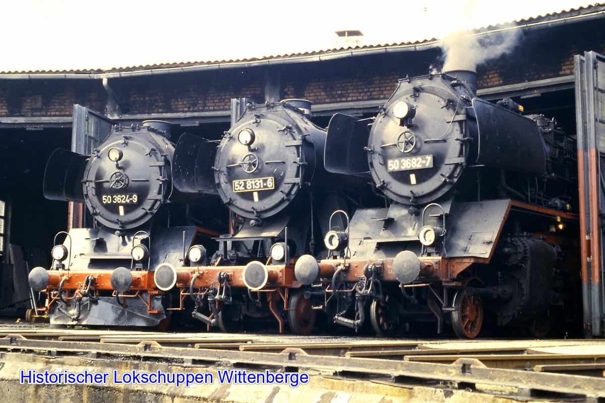 On 30 April 2000, three of our exhibits basked in the sun in front of the locomotive shed in Salzwedel. 52 8131 has since left us and belonged to the company WFL Wedler Franz Logistik GmbH, which has since restored the locomotive to working order. The locomotive was sold to the Lausitzer Dampflokclub in 2020. The other two locomotives, 50 3624 and 3682, are still part of the collection in Wittenberge.