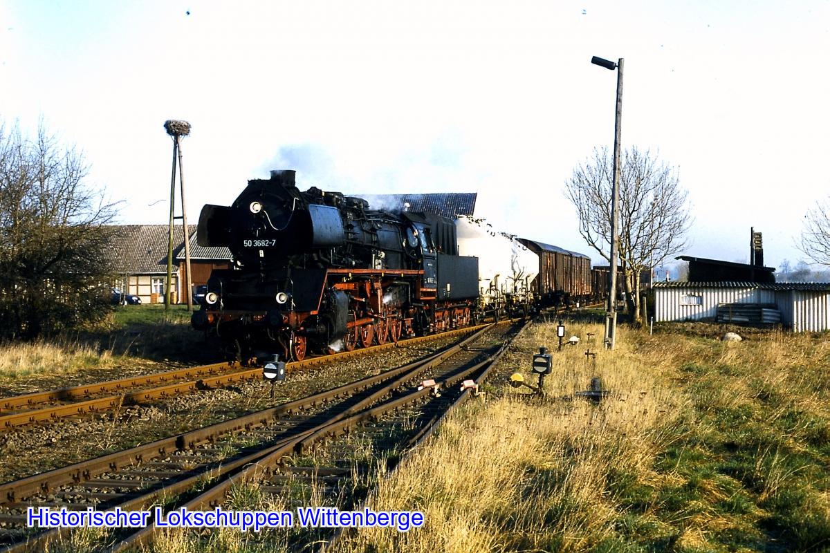 On 30 April 1999, a big station festival was celebrated in Röbel on lake Müritz. On this occasion, special trains also travelled on various lines in the area. Today we are showing a picture of our steam locomotive 50 3682, which is racing against 52 8029 stationed in Röbel as they leave Ganzlin station. 50 3682 is travelling with its train to Pritzwalk, while 52 8029 is turning off to Röbel.