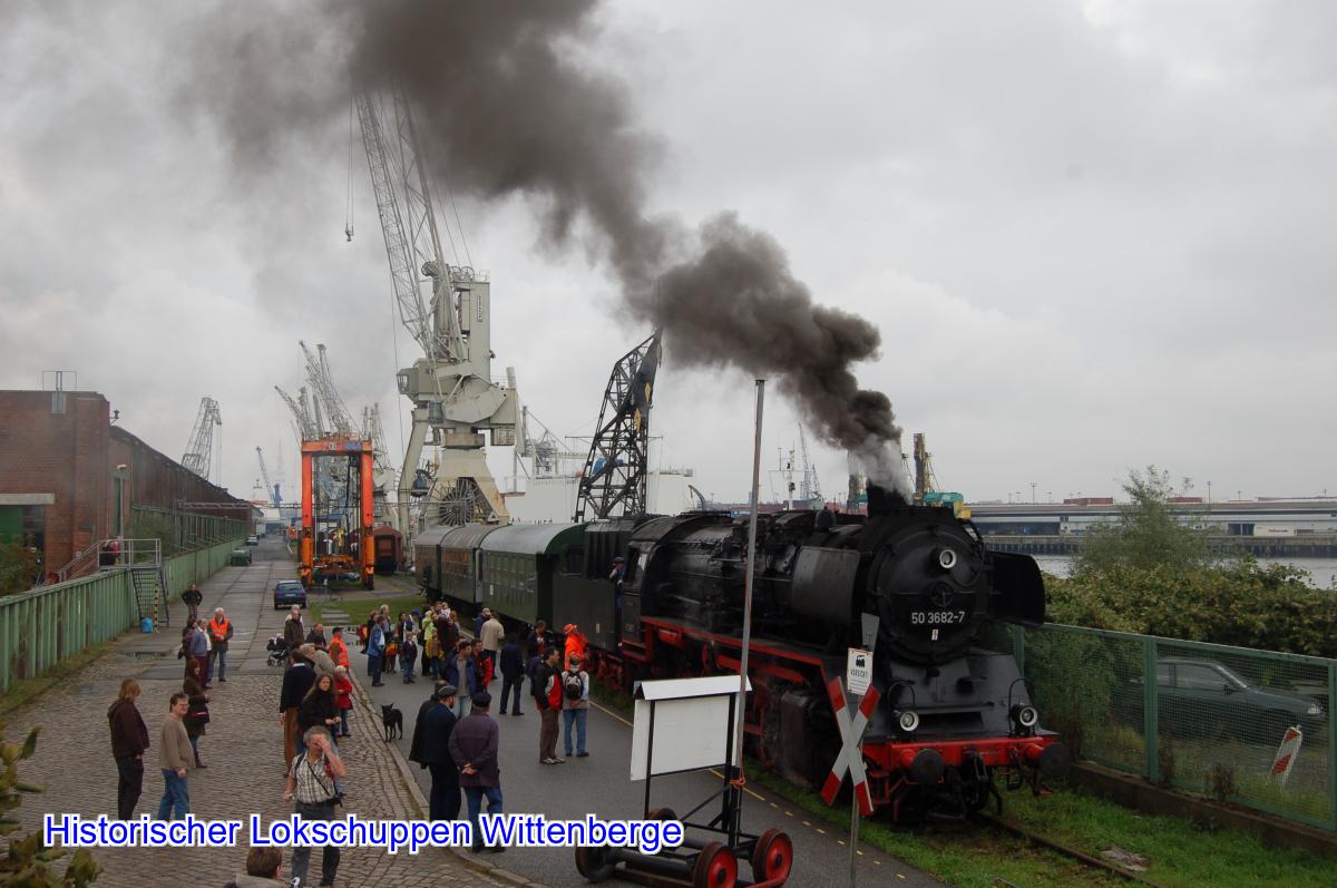 On 28 September 2007 we hauled round trips through the port of Hamburg with our steam locomotive 50 3682, starting and ending at Hamburg-Harburg station. A stop was always made at the harbour museum, where the train is shown in the following picture.