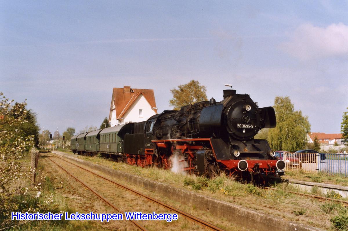On 25 April 2004 we celebrated our 10th anniversary. This was reason enough to invite a few guest locomotives to Salzwedel and run them in front of special trains. The following picture shows the steam locomotive 50 3695 of the Staßfurt railway friends with wagons of the Arbeitsgemeinschaft Verkehrsfreunde Lüneburg (AVL) in Arendsee.