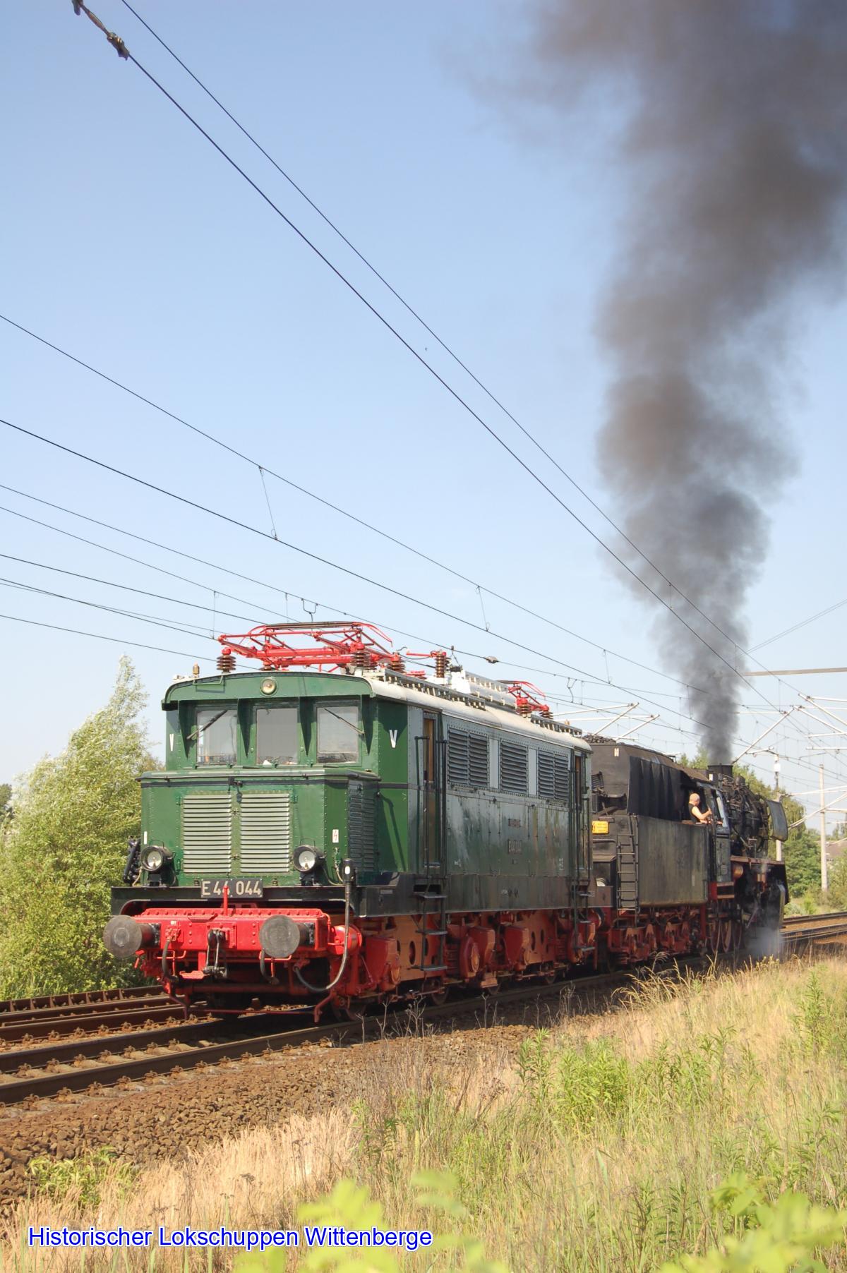 The Hanseatic Festival was celebrated in Salzwedel at the beginning of June 2008. Reason enough for us to invite some guest vehicles to Salzwedel. Here we see the electric locomotive E44 044 from Dessau being towed into our museum by our steam locomotive 50 3682.