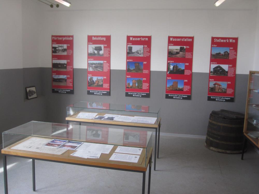 This is a view of the museum's exhibition room. Here, active members of the society have assembled a selection of everyday small parts which are on show in display cabinets. On the walls are photographswhich illustrate the condition of some of the striking buildings and equipment taken when the depot was still operating, then while it was lying idle in the 2000s and finally after its renovation. An interesting journey through time.