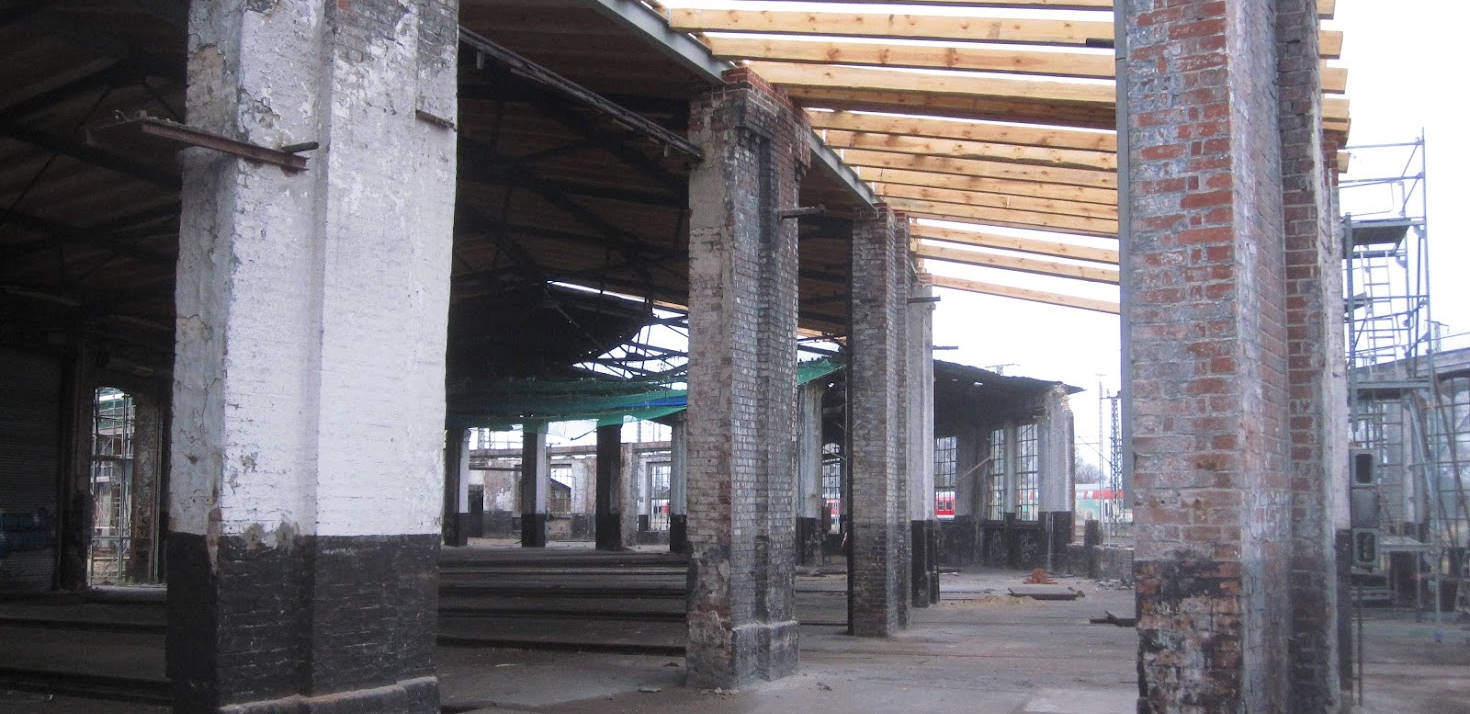 A look inside the engine shed. At the beginning of the renovation work, the rear wall of the locomotive shed had to be partially removed and rebuilt reinforced with metal scaffolding. Only then could a new roof be erected. Today it protects our exhibits from wind and weather.