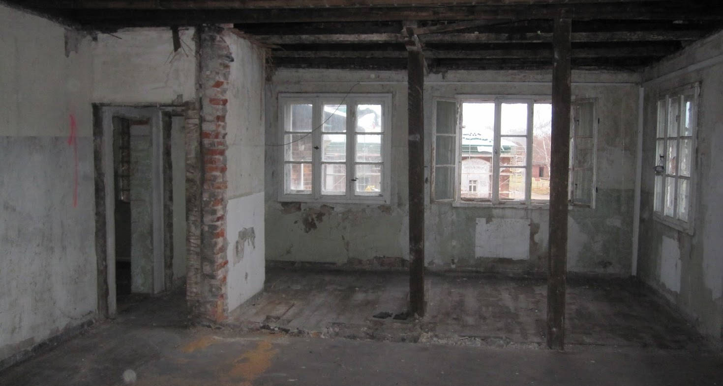 View into the interior of the former dispatcher room. In front of the partition wall sat the dispatchers, who distributed the daily tasks to the locomotive crews through the still recognisable window in the wall. The partition wall was removed and the reception area of the museum was created.