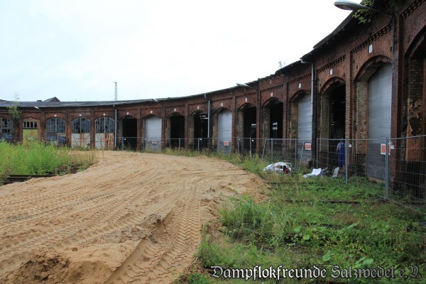 Inzwischen haben die Bauarbeiten im Bereich der Lokschuppen II und III des ehemaligen Bw Wittenberge begonnen: