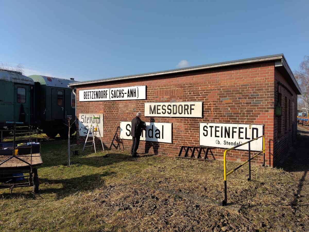 Neue alte Exponate finden sich auch am sogenannten Kohlenhof. Hier haben wir etliche Stationsschilder von teilweise längst aufgegebenen Bahnhöfen angebracht. Sie stammen aus der Sammlung des verstorbenen Wolfgang List aus Stendal.
