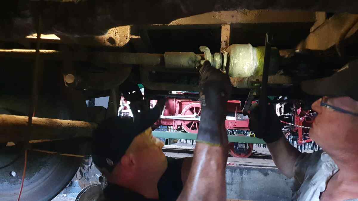 Aus der Dieselfraktion werden wir Ihnen voraussichtlich unsere Kleinloks der Deutschen Reichsbahn und der Osthannoverschen Eisenbahn vorführen. Daneben erleben Sie auch die Großdieselloks V320 und voraussichtlich 114 774. An letztgenannter arbeiten wir noch im Rahmen ihrer Hauptuntersuchung. Inzwischen konnten die Kardanwellen der Lok wieder eingebaut und die Bremsteile zusammengesetzt werden. Fahren und bremsen kann sie also schonmal wieder.